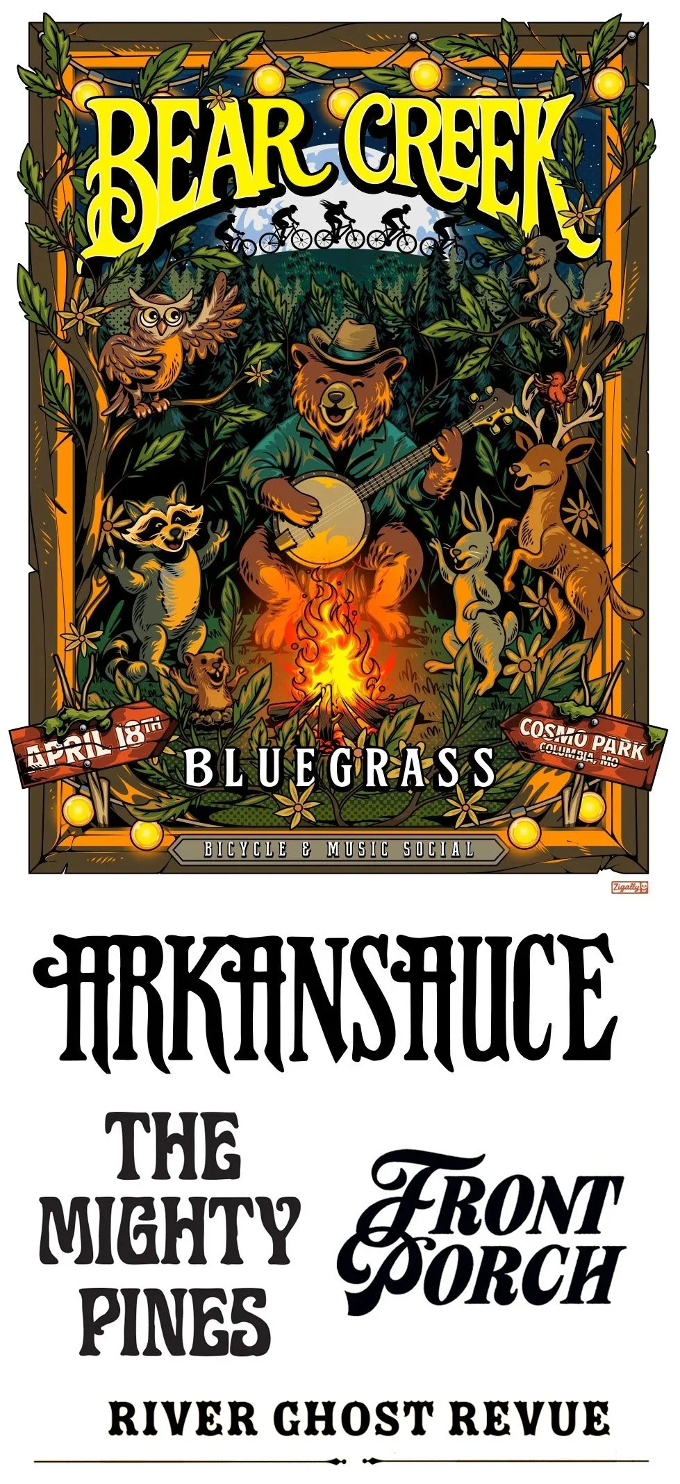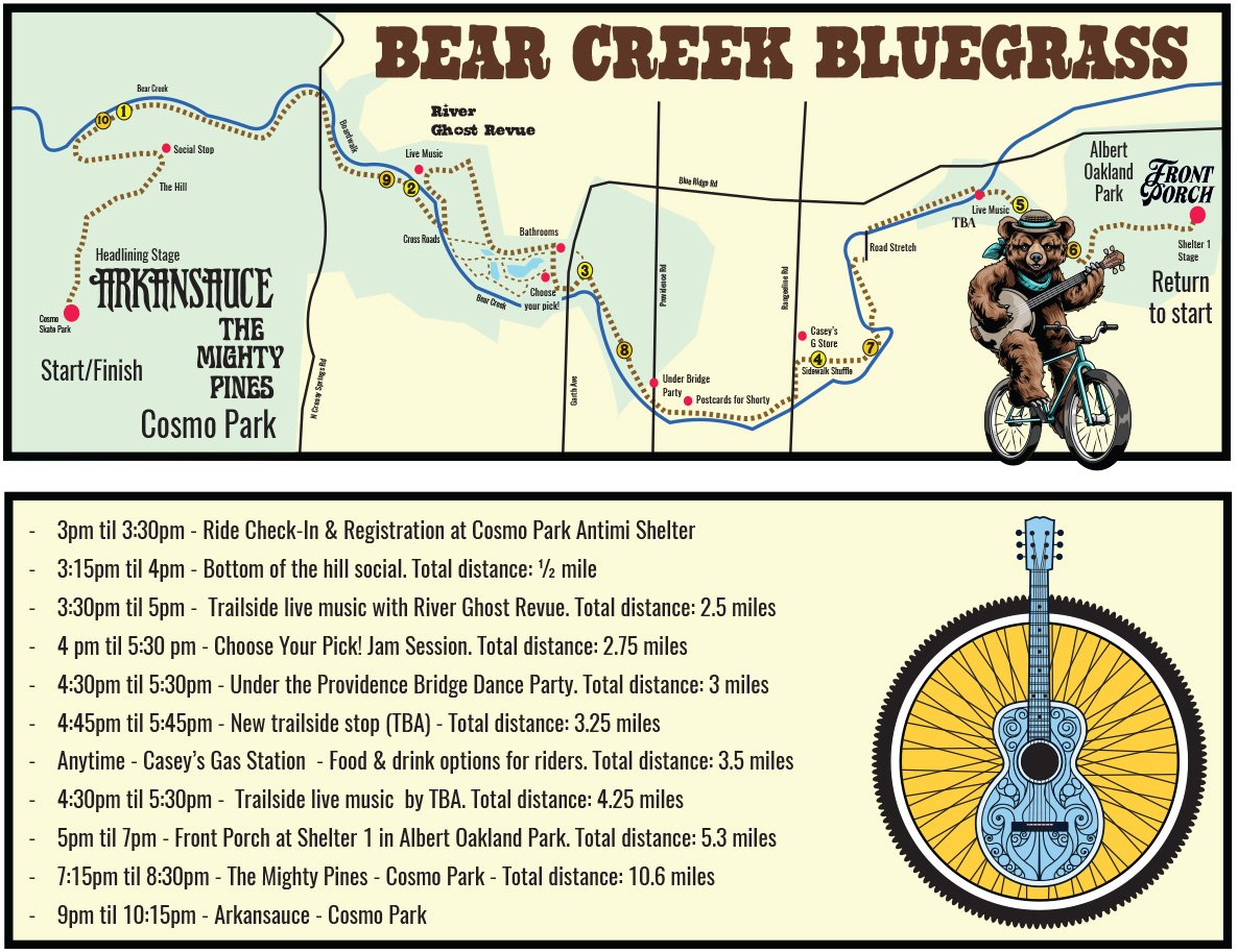 Join a fun loving group of social bike riders on a relaxed tour of the Bear Creek Trail! Departing from Columbia’s beautiful Cosmo Park on the the Bear Creek Trail. The ride travels 11 miles total on a crushed limestone and car-free trail that ends at Albert Oakland Park. Riders will meet up at the Antimi Shelter near the skate park at Cosmo Park. After departing on the Bear Creek Trail riders will ride around 2 1/2 miles before reaching their first trailside music stop! After continuing on ride, participants will explore the trail and experience more trailside music until reaching Albert Oakland Park. There riders will regroup at park Shelter #1. Here they will be rewarded with a stage show from Front Porch! After the mid-ride break, it will be time to ride the trail back to Cosmo Park where the main stage will be waiting with the headlining entertainment from The Mighty Pines and Arkansauce!