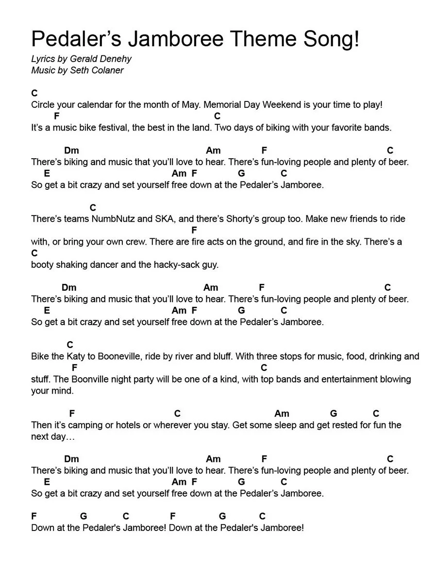 The poster is a tribute to the late great Jerry Denehy who penned the lyrics to a song called “Down at the Pedaler’s Jamboree” about the ride who cared so much for. He rode every mile of the every Pedaler’s Jamboree and was friends to all that he met along the journey. The character in the top left is Jerry! Some of the other characters from the song lyrics made the poster design too! The lyrics are below. See how many you can recognize!