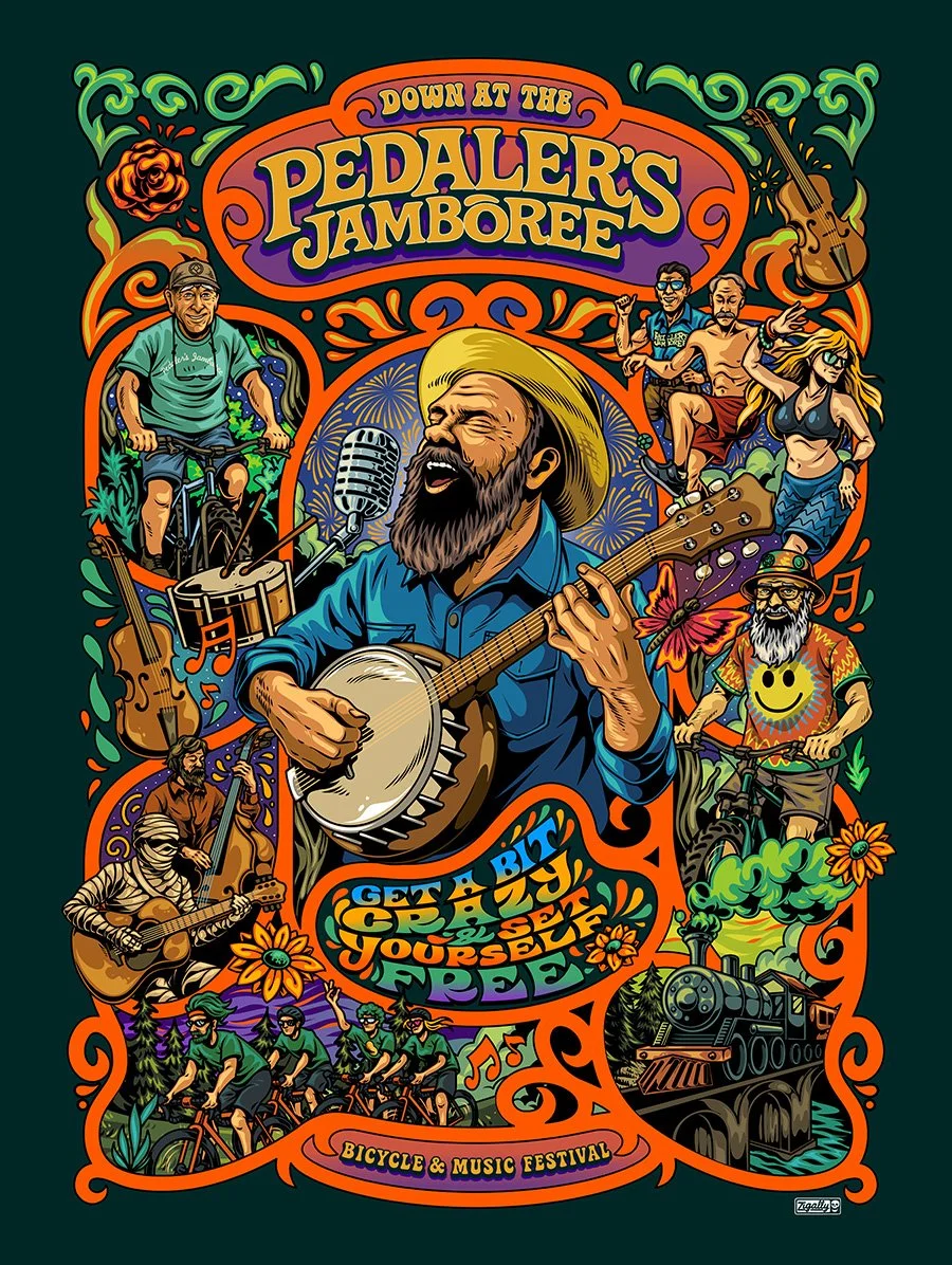 Hard to believe that this will be the 15th Pedaler’s Jamboree! Keeping up with the annual tradition of having a new poster designed for the ride, we decided to continue to work with the creative mind of Zigally on another work of art in 2024! Not only is his artwork amazingly imaginative and masterfully crafted but it also a perfect fit for stickers, jerseys and all the fun loving swag that everyone loves to get on the ride! In collaboration with our event partner Shelter Insurance we were able to give away a couple thousand free posters of the 2023 design last year and will be getting new posters out to riders this spring! What a treat to get great artwork into the hands of our favorite people!